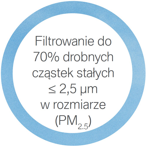 | Filtrowanie do 70% drobnych cząstek stałych ≤ 2.5 μm w rozmiarze (PM2.5) | ||